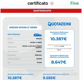 Nissan Micra 2018 – Ottime condizioni Vendo Nissan Micra anno 2018 in perfette condizioni, sia interne che esterne, per inutilizzo. L’auto è stata sempre tagliandata regolarmente e tenuta con grande cura. Recentemente sono stati effettuati alcuni lavori importanti: - Cinghia di distribuzione cambiata da poco - Batteria nuova - Doppie chiavi disponibili - Block system In allegato anche il certificato Quattroruote attuale del valore dell’auto. La macchina è pronta all’uso, affidabile e senza lavori da fare. Per informazioni o per vederla contattatemi in privato.
