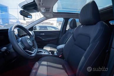 1 Airbag tra sedili anteriori - 2 Airbag Frontali - 2 Airbag anteriori laterali - 2 Airbags a tendina - 4 Altoparlanti - Alette parasole con specchietto di cortesia (guidatore e passeggero) - Alzacristalli elettrici 1 touch - Antenna Shark - Antifurto Perimetrale - Apertura bagagliaio hands-free - Around View Monitor con rilevamento oggetti in movimento - Avviso Cinture di Sicurezza Posteriori - Blind Spot Intervention - Blind Spot Warning - Bluetooth (telefono e audio) - Bracciolo posteriore con portabicchieri - Caricabatterie Wireless - Cassetto Portaoggetti con luce di cortesia - Cerchi in lega da 19" Edge - Cielo abitacolo nero - Climatizzatore dual zone - Drive Assist - Drive modes (Selettore modalità di guida) - Driver Attention Alert - E-Call Emergency Call - Fari Automatici Intelligenti (Sensore Crepuscolare) - Fari LED con tecnologia Adaptive Driving Beam Assist (Fari abbaglianti adattativi) - Fissaggi Isofix (Sedili posteriori) - Freno di stazionamento elettronico - Head-up display da 10,8" - Hill start assist & auto hold - Illuminazione ambientale (Console centrale e Portiere) - Illuminazione bagagliaio - Indicatori di direzione anteriori e posteriori LED - Integrazione Smartphone e compatibilità Apple CarPlay e Android Auto - Intelligent Cruise Control - Intelligent Forward Collision Warning - Intelligent Front Emergency Braking with Pedestrian, Cyclist & Junction assist - Intelligent Key (Apertura porte e Avviamento motore) - Lane Departure Prevention - Lane Departure Warning - Lane side support - Luci diurne Led - Luci posteriori LED (frenata e luci posizione) - Navigatore satellitare NissanConnect con schermo da 9" mappe TomTom, Premium Live Traffic, Aggiornamenti Over The Air e NissanConnect Services - Paraurti posteriore con inserti silver - Porta bicchieri - Porte USB posteriori solo per la ricarica - Presa USB Ant. - Prese 12V (Abitacolo e Vano