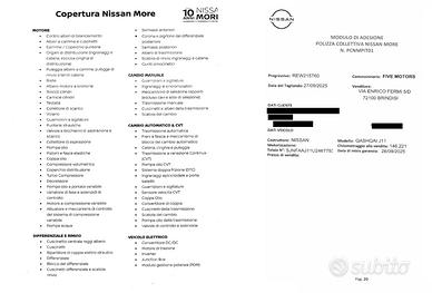 Nissan Qashqai 1.5dci 116cv 2019 allestimento “Qashqai 1.5 dCi Acenta”, alimentazione diesel, cambio manuale a 6 marce, colore bianco, unico proprietario che l’ha acquistata nuova il 30.04.2019 presso la Conc. Uff. NISSAN di Melpignano (LE) “AB AUTO SPA” ove sono state eseguite le prime manutenzioni e successivamente presso la Conc. Uff. Nissan di Taranto (TA) “FIVE MOTORS SRL”, con ultima eseguita il 27.09.2025 a 146.221 km ove oltre al tagliando completo (olio e tutti i filtri) è stato sostituito anche il kit distribuzione con relativa pompa acqua e sostituiti i pattini freno anteriori, per una spesa fatturata di Euro 1.195,00. Vettura in GARANZIA UFFICIALE “NISSAN MORE” sino al 26.09.2026, con possibilità di estensione sino al DECIMO dall’immatricolazione (anno 2029) grazie all’estensione di garanzia “NISSAN MORE” che si rinnova “gratuitamente” nel caso in cui vengano eseguite le manutenzioni annuali secondo il programma Nissan. Vettura in ottime condizioni, molto economica nei consumi, con all'attivo 146.227 km (la maggior parte fatti in autostrada), motorizzata con un 1.461 cc diesel da 116 cv (85 kw), ADATTA A NEOPATENTATI, classe ambientale Euro 6, consumi di circa 17-18 km/l, ottime prestazioni, cambio manuale fluido e preciso. Versione ACENTA con: chiusura centralizzata con telecomando, Alzacristalli anteriori e posteriori elettrici, Climatronic bi-zona, sensori di parcheggio anteriori e posteriori con visualizzazione sul display, radar con frenata d'emergenza, Avviso Uscita di Corsia, cerchi in lega da 17 pollici, fari anteriori automatici con diurna Led, fari posteriori led, Regolatore/limitatore di velocita', radio CD con Bluetooth / Usb / comandi vocali, volante in pelle con comandi integrati, servosterzo, airbag, kit ruota di scorta, luci ambiente, freno di stazionamento elettrico e tanti altri optionals. Qualsiasi test con vostro meccanico di fiducia e/o in Officina NISSAN. Ultima revisione effettuata il 10.04.2025 a 132.620 km con scadenza ad Aprile