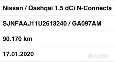 VETTURA IN ARRIVO AUTO ITALIANA – TARGA: GA 097 AM ULTIMA FOTO ( una parte della nostra fattura d'acquisto ) :ALLESTIMENTO-TELAIO - TARGA ITALIANA - KM - ANNO D'IMMATRICOLAZIONE Nissan Qashqai cc1.5DCI 116cv , GENNAIO 2020 , allestimento N-CONNECTA ,con 90170 km , cambio manuale a 6 marce ALLESTIMENTO N-CONNECTA : FULL OPTIONAL : CAMERA 360 – NAVIGATORE - TETTO PANORAMICO – CERCHI IN LEGA BICOLORE – FARI FULL LEDANTERIORI E POSTERIORI – SENSORI DI PARCHEGGIO ANTERIORI E POSTERIORI – CLIMABIZONA - SPECCHIETTI RICHIUDIBILI ELETTRONICAMENTE DUE CHIAVI REVISIONE DA FARE A GENNAIO 2028 Ottime condizioni generali interne, esterne e meccaniche Garanzia e possibilita' di finanziamenti a tasso agevolato SI VALUTANO PERMUTE L'auto è disponibile a Sommatino ( CL ) in viale fontaine 10( vicino la caserma dei carabinieri ) per qualsiasi vostra prova e controllopresso meccanico di vostra fiducia . Non esitate a contattarmi per qualsiasialtra informazione alla mia email o direttamente al mio cellulare anche whatsapp PREZZO: 17300 euro - 1 ANNO DI GARANZIA CONFORMGEST SPA (COMPLETA ) INCLUSA NEL PREZZO – PASSAGGIO DI PROPRIETA' ESCLUSO