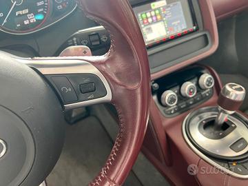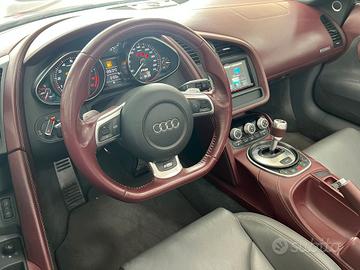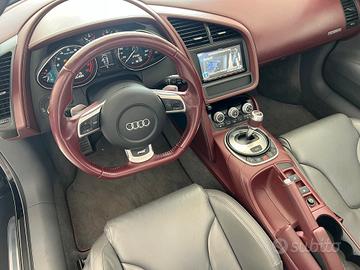 ACCESSORI: Sedili riscaldati Riscaldamento sedili ant., Sedili ant. a regolazione elettrica, Controllo di distanza nel parcheggio, Aiuto parcheggio ant. e post., ottico con retrocamera posteriore posteriore con macchina fotografica libera di retrovisione che supporta la visione notturna utilizzando una serie di luci a infrarossi per il backup al buio, (APS Advanced), Servosterzo comando elettronico, Sedili sportivi, Sistema di navigazione Integrato, Airbag lato passeggero disinseribile, Airbag lato guida / lato passeggero, Climatizzatore automatico comfort 2 zone, Differenziale a scorrimento limitato, Blocco differenziale elettronico (EDS), Alzacristalli elettr. ant., Electronic Stability Program (ESP), Immobilizzatore (elettronico), trazione integrale permanente, Blocker vento posteriore, Computer di bordo, Sistema informazione conducente (FIS), Impianto antifurto + protezione abitacolo / protezione traino, Sistema di intrattenimento, ABS Sistema antibloccaggio in frenata (ABS), Regolazione antislittamento trazione (ASR), Allestimento int.: Audi exclusive pelle nappa pregiata, Azionamento capote automatic., Cambio 6 marce - Automatico Sequenziale - R-tronic, Antifurto per ruote (chiusura cerchio), Parabrezza con striscia parasole super., Infotainment Center incl. interfaccia multi-media MMI, Specchio int. con auto anabbagliante, Serbatoio carburante: 80 Ltr., Supporti lombari ant., a regolazione elettrica, Pacchetto luci, Motore 5,2 Ltr. - 386 kW V10 40V FSI, Pedali alluminio, Kit riparazione pneumatici, Sound System Bang & Olufsen, Elementi comando Audi exclusive pelle, Allestimento int.: inserti decorativi Audi exclusive pelle, Consolle ctr. e mascherina radio in pe
