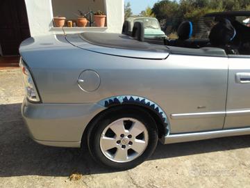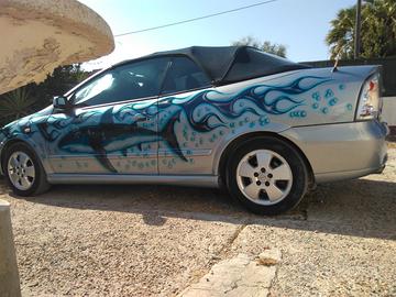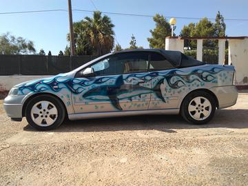 VENDO A 650 EURO TRATTABILI, per pezzi o ad appassionati, Opel Astra G 1.8i 16v cat Cabrio Bertone aerografata da un famoso artista cagliaritano, dotata di: motore con problemi di distribuzione ma diverse parti sostituite di recente; gruppo ABS da sostituire ma frena perfettamente; problemi di elettronica (seppure cambiata di recente la centralina) che fanno restare diverse spie accese e la ventola del radiatore sempre in funzione quando si avvia il motore; gomme nuove; parabrezza nuovo; fari posteriori nuovi; trasmissione perfetta; Il condizionatore è stato riparato da poco e funziona; ammortizzatori, sterzo e cambio perfetti; l'apertura capotta funziona perfettamente; autoradio nuovo con schermo touch screen e telecamera posteriore. La macchina non è più marciante ma trovando i ricambi si può risistemare con meno di mille euro.
