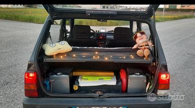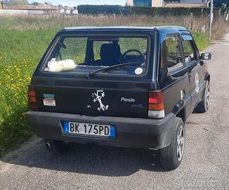 Vendo Panda per Bad Boys. Accetto qualsiasi offerta, preferibilmente SENSATA. Volante (nuovo) sportivo a calice in alluminio e alcantara nera con cuciture rosse. Leva cambio allungata con pomello abbinato alla maniglia del freno a mano e al cruscotto (verniciato nero e rosso). Coprisedili mimetici (sedili originali in stoffa azzurra/blu NON lacerata). Autoradio con telecomando, CD (a scoparsa) e AUX (ci si collega il cellulare per telefonare in vivavoce o ascoltare musica). Impianto audio a 4 uscite (4x50w) con tutti gli altoparlanti a tre vie (posteriori casse x hi-fi con il woofer "giusto"). Portaoggetti "Camel Trophy". Navigatore GARMIN con display mappa, direzione, altitudine, ora e velocità effettiva. Bussola e termometro sopra cruscotto (stile 4x4). Presa accendisigari 12V. Deflettori su finestrini anteriori. Specchietti retrovisori DX e SX regolabili dall'interno. Catene da neve originali (anni '90). Cerchi lega con canale da 6" rovesciato (anni '90); cerchi in ferro originali FIAT disponibili (senza pneumatici). Pneumatici All Season (circa al 50%) nella misura originale da 155. Ammortizzatori, dischi e pastiglie freno anteriori nuovi. Sostituiti fanali anteriori (x parabola scrostata) e la mascherina frontale originale con una nera opaca. Meccanica originale, 900 cc con distribuzione a CATENA. Modello 900 young del 2000, Euro 2, 5 marce, iniezione elettronica. NO 4x4 Doppie chiavi. Km 325.000 circa Max 142 km/h 0-100 km/h? Con 45 cv il risultato è imbarazzante, ma la terza e la quarta sono spettacolari!!! Ho fatto eseguire una particolare regolazione dell'assetto originale FIAT che dona al Pandino un'eccezionale stabilità in curva: rotonde sempre a tavoletta!!! IN USO QUOTIDIANO; mia da tre anni. NO abs, airbag, aria condizionata, finestrini elettrici, chiusura centralizzata e NO confort! NOTA BENE Ha tutti i difetti che deve avere una Panda vissuta di 26 anni, ma NON ha ruggine passante.