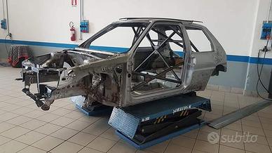 Monta un rollbar OMP omologato FIA, 8 punti saldato sulla scocca con libretto annesso. I pannelli carrozzeria in fibra di carbonio (tetto, cofano, portellone, portiere, fianchi anteriori) sono stati cotti in autoclave e sono copie fedeli degli originali (hanno il lamierato interno e le porte hanno le serrature originali), come il sedile (replica Tillet, più spesso e rigido dell’originale), alettone e splitter.
