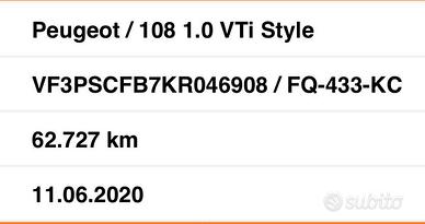 AUTO BEN TENUTA - COME NUOVA IDEALE PER NEOPATENTATI PEUGEOT 108 cc1.0 VTI 72CV BENZINA - ALLESTIMENTO STYLE TOP , GIUGNO 2020 , EURO 6 , con circa 62749 km ULTIMA FOTO ( una parte della nostra fattura d'acquisto ):ALLESTIMENTO-TELAIO - TARGA ESTERA - KM- ANNO D'IMMATRICOLAZIONE Ultimo tagliando: 21/07/2025 Chilometraggio ultimo tagliando: 60.227 km REVISIONE DA FARE A GIUGNO 2026 DUE CHIAVI - RUOTA DI SCORTA Ottime condizioni generali interne, esterne e meccaniche Garanzia e possibilita' di finanziamenti agevolati. Sivalutano permute. L'auto è disponibile a Sommatino ( CL ) in viale Fontaine 10( vicino la caserma dei carabinieri ) per qualsiasi vostra prova e controllocon meccanico di vostra fiducia . Non esitate a contattarmi per qualsiasi altrainformazione alla mia email o direttamente al mio cellulare anche whatsapp PREZZO 7999 euro 1 ANNO DI GARANZIA CONFORMGEST SPA INCLUSA NEL PREZZO - PASSAGGIO DI PROPRIETA' ESCLUSO