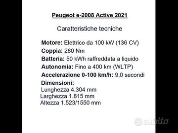 Altre opzioni: 3 Appoggiatesta Posteriori;Accensione automatica dei fari;Active Safety Brake;AFU;Autonomous Emergency Braking System 3 (sistema di frenata anticollisione giorno e notte);Badge dedicati;Caricatore OBC (On Board Charger) 7,4 kW monofase;Cavo di ricarica domestica Tipo 2/EF presa Schuko;Cavo di ricarica T2 Modo 3 Trifase 22kW con custodia dedicata;Cerchi in lega 16" ELBORN;Distance Alert;Drive mode (normal /eco/sport);Driver Attention Alert;Griglia calandra con dettagli in tinta carrozzeria;Hill Assist;Interni in tessuto Pneuma 3D Nero / Grigio e cuciture Orange;Kit di riparazione pneumatici;Lane Keeping Assist;Logo del Leone cangiante;Pannelli porta con dettagli Orange;Peugeot Connect SOS & Assistance;Plancia con decori aspetto Carbonio;Proiettori anteriori alogeni e artigli anteriori con DRL a LED;Quadro strumenti con display centrale monocromatico 3,5;REF;Regolatore/Limitatore Di Velocita Con Soglie Programmabili;Retrovisori Esterni Con Indicatori Di Direzione Integrati;Sedile conducente regolabile in altezza;Sedile Posteriore Con Schienale Frazionabile 2/3 1/3;Speed Limit Detection;Tergicristallo automatico;Traffic Sign RecognitionNote concessionario: SEDE DI MODENA 1 presa USB anteriore aggiuntiva di ricarica e 2 prese USB posteriori di ricarica - Cavo di ricarica domestica Tipo 2/EF presa Schuko - Cavo di ricarica T2 Modo 3 Trifase 22kW con custodia dedicata - Touchscreen 7'' con Mirror Screen (Apple CarPlayTM/Android Auto) , 6 altoparlanti e 1 presa USB dati/ricarica -