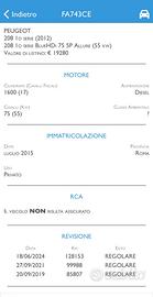 Salve vendo stupenda Peugeot 208 Restyling 1.6 HDi 75 Cv 5 Porte adatta alla guida per neopatentati è dai consumi bassissimi Anno 2015 con 140.000 Km..Unico Proprietario..Revisionata..Tagliandata è Gommata al 70%..Auto in ottime condizioni è non necessita di alcun intervento..Motore , Meccanica è Carrozzeria in perfette condizioni..Interni senza alcun segno di usura..Modello Allure Full Optional è dotata di alza cristalli elettrici..chiusura centralizzata..clima..servo sterzo..sedile è volante regolabile in altezza..computer di bordo..stereo touch screen originale di serie con comandi multifunzionali al volante è collegamento telefonico bluetooth..usb è aux..specchietti elettrici..sensori parcheggio sonori posteriori..luci diurne a led..stop a led..fari lenticolari..faretti fendinebbia..cerchi in lega ecc..