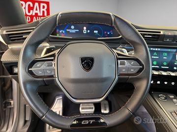 Equipaggiamenti: - 3D Connected Navigation - 6 Airbags (frontali, laterali, a tendina) - Accensione luci automatica con sensore crepuscolare - Adaptive Cruise Control con funzione Stop&Go - Alzacristalli con inserti cromati - Anti-Slip Regulation (ASR) - Appoggiagomiti centrale anteriore apribile in due parti con illuminazione interna - Badge "GT" in grigio Basalto sui montanti posteriori e portellone posteriore - Barre al tetto longitudinali in alluminio - Blind Spot Detection - Blocco finestrini posteriore per sicurezza bambini - Bluetooth - Calotte specchietti retrovisori in nero lucido - Cambio automatico a 8 marce - Cerchi in lega da 18" 'Epherra' Bicolore Diamantati - Chiave con transponder - Chiusura automatica porte quando la vettura è in movimento - Chiusura centralizzata - Cielo abitacolo in tessuto nero - Climatizzatore automatico bi-zona - Cofano attivo per sicurezza pedoni - Correttore assetto fari - Cruise control e limitatore di velocità - DAB (Digital Terrestrial Radio Broadcasting) - Doppio cavo di ricarica - Drive Assist Plus Pack - Driving Mode selector : Eco/Normal/Sport - Dynamic Stability Control (DSC) - Emergency Braking System con camera e radar - ESC - Electronic Stability Control - ESC - Electronic Stability Control - Extended Traffic Sign Recognition - Fari posteriori Full LED con indicatori di direzione dinamici - Firma Peugeot posteriore in nero - Freno di stazionamento elettrico e Hill Assist - Illuminazione d'ambiente blu su plancia di bordo, pannelli porte e console centrale - Immobilizzatore - Indicatore perdita di pressione pneumatici - Indicatore temperatura esterna - Interni Misto TEP/Alcantara con cuciture Akinite - Keyless access and start - Kit riparazione pneumatici - Modanatura cruscotto e pannelli porta effetto Carbonio , console centrale in nero lucido - Parte inferiore paraurti anteriore in Nero lucido - Pedaliera in alluminio - Peugeot i-Cockpit con head-up digital Display