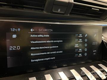 ACCESSORI: cerchi in lega 18'' Sperone, body kit GT, vetri post.ri oscurati, luci diurne e proiettori direzionali Full Led (con HBA), rilevatore ostacoli ant.re e post.re, retrov. esterni regolab. e ripieg. elettr., retrov. interno fotocrom., climatizzatore automatico bizona, modulo mp3 con usb, 3D Connected Navigation 10'' HD (con radio DAB, sistema di navigaz., connettività per smartphone e VisioPark 180), Peugeot i-Cockpit 3D con Head Up Digital Display 12.3'', sensore luci e pioggia, volante sportivo in pelle multif. con paddle cambio, Adaptive Cruise Control, airbags, abs afu ref, esp, Hill Assist, Active Safety Brake, Lane Keeping Assist & positioning, Blind Corner Assist, Driver Allert, Traffic Sign Recogn., Drive Mode, keyless system, freno di stazion. elettr., 4 vetri elettr., sedili sportivi misto tessuto/TEP Mistral.