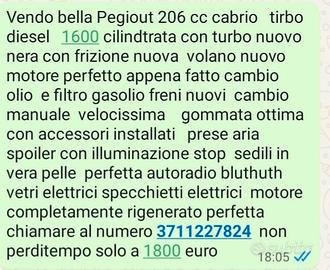 Vendo Peugeot 206 cc cabrio nera turbo diesel 1600 cilindrata 16 valvole, con frizione appena fatta e volano motore perfetto, appena eseguito cinghia distribuzione, freni nuovi, gommata ottima, accessori installati spoiler con luci prese aria autoradio Bluetooth, vetri elettrici ,specchietti elettrici filtri cambiati, motore completamente rigenerato, turbo nuovo, perfetta astenersi da perditempo prezzo 1800euro chiamare al numero 371227824 vero affare cabrio