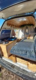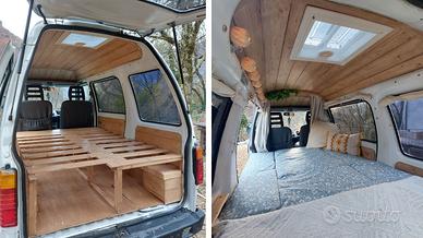 La panca e la cucina e parte del letto sono il legno di paulonia leggerissimo. La conversione e’ stata pensata per essere rimossa facilmente, in 5mn si puo’montare e smontare. Si attacca al pavimento tramite viti a farfalla. Non sono stati effettuati fori sulla carrozzeria sono stati usati quelli esistenti.
