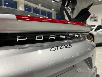 Mod. GT4 RS - 250 Cambio a doppia frizione Porsche Doppelkupplung (PDK) - 61 Pacchetto interni Weissach con ampi elementi in Pelle e Race-Tex, nero-grigio Artico - 00480 Scelta colore del filo Giallo Racing - 082 Serbatoio del carburante da 90 litri - 1G8 Sigillante per pneumatici - 421 Cerchi da 20 pollici 718 Cayman GT4 RS in alluminio forgiato - 450 Porsche Ceramic Composite Brake (PCCB) - 454 Cruise control - 474 Sistema di sollevamento dell’asse anteriore - 509 Estintore - 513 Logo Porsche in colore argento (lucido) - 630 Pacchetto Light Design - 634 Fari principali a LED, compreso il Porsche Dynamic Light System (PDLS) - 637 ParkAssist (posteriore) con telecamera posteriore - 810 Tappetini - 9VL BOSE Surround Sound System - 9ZE Vano porta Smartphone - P11 Sedili a guscio integrali - P13 Dispositivo automatico antiabbagliante con sensore pioggia integrato - P74 Pacchetto Weissach: Condotto aerazione e copertura air box con scritta GT4 RS, Finiture esterne i
