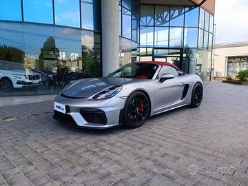 Coperture impianto lavafari verniciateRoll-bar verniciati nel colore esternaTappo serbatoio con finitura in alluminioCerchi verniciati in nero satinato (completi)Pacchetto interni Spyder ClassicCinture di sicurezza Rosso BordeauxRivestimento colonna sterzo in pelleSchienali sedili Sport Plus in pellePacchetto rivestimenti porte in pelle/AlcantaraAlette parasole in AlcantaraCoperchio vano portaoggetti in Alcantara con stemma Porsche CrestBattitacco illuminati in carbonioVassoio portasmartphoneRete portaoggetti vano piedi passeggeroSedili sportivi adattivi Plus (18 vie, elettrici)Sedili riscaldatiClimatizzatore automatico bizonaPannello comandi climatizzatore verniciatoPacchetto fumatoriTappetiniAttacchi ISOFIX per seggiolino sul sedile passeggero anterioreVolante multifunzione riscaldatoSistema audio Burmester High-End Surround Sound SystemRadio digitale DABApple CarPlayNavigazioneFari principali a LED con Porsche Dynamic Light System Plus (PDLS Plus)Pacchetto luci designCruise ControlParkAssist (posteriore) con telecamera per retromarciaIndicatore limiti di velocitàSpecchi esterni ripiegabili elettricamente con luci di cortesiaSpecchi interni ed esterni con funzione antiabbagliamento automatica e sensore pioggiaParabrezza con fascia superiore grigiaImpianto di allarme con sorveglianza interna