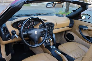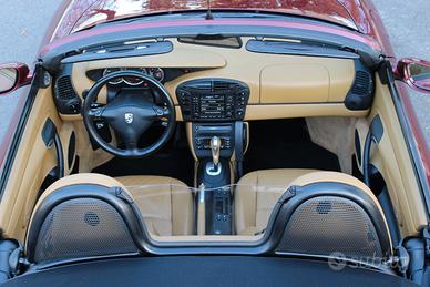 - allestimento eccezionale: non troverete nessuna altra Boxster con questo allestimento. Equipaggiata con cambio Tiptronic S a 5 rapporti, Impianto lavafari, cerchi Carrera Wheels 17" con pneumatici 205/50 anteriore e 255/40 posteriore, volante con airbag a 3 razze, coprimozzo concavo con stemma Porsche colorato, regolazione automatica della velocità, pacchetto audio con amplificatore, supporto lombare a destra e a sinistra, deflettore del vento, climatizzatore automatico, Fari Litronic (Xenon), ParkAssist posteriore, computer di bordo, Porsche Communication Management (PCM) compreso modulo di navigazione, modulo di telefono, radio, lettore audiocassetta e cornetta passiva per modulo telefonico (PCM), lettore 6 CD, soft ruffled leather seats, riscaldamento sedile sinistro/destro, sedili completamente elettrici sinistra/destra (8 vie), traction Control (TC), Automatic Brake Differential (ABD) and Anti-slip regulation (ASR), protezioni d'ingresso in acciaio inox con logo modello, sensore pioggia per tergicristallo, specchi retrovisori elettrici riscaldati, automatically dimming interior and exterior mirror, Tiptronic Gear Selector aluminium/leather, Handbrake Lever aluminium/leather.