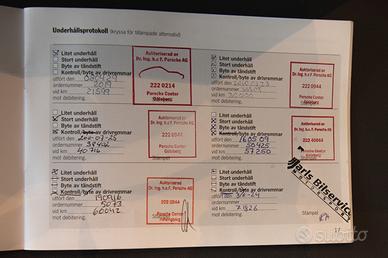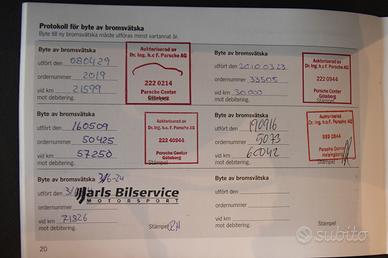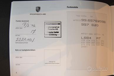 Vettura in ottime condizioni generali, regolarmente tagliandata PORSCHE, è presente il libretto dei tagliandi originale e la trousse completa che ne certifica il chilometraggio. La vettura monta radio PORSCHE CLASSIC che include Apple car play e android auto. E' comunque presente la sua radio originale che consegneremo insieme all' auto. IL BOLLO E IL SUPER BOLLO SONO STATI PAGATI FINO AL 31/12/2025, dal prossimo anno la vettura può essere iscritta ASI come auto d'epoca. Mettendola quindi in esenzione da bollo e super bollo. La vettura si presenta in ottimo stato, non presenta segni evidenti ma un normale stato di usura per un auto di 20 anni. Siamo disponibili per eventuali domande, chiarimenti, visione e prova. PRONTA CONSEGNA. NESSUN VINCOLO DI FINANZIAMENTO Prima immatricolazione: Marzo 2006 Km: 76.577 Prezzo: 74.900 € Rif. 25 EQUIPAGGIAMENTO: cerchi in lega da 19" TURBO pinze freni rosse pneumatici asse posteriore 305/30 zr 19 pneumatici asse anteriore 235/35 zr 19 pulsante SPORT ( apre lo scarico e passa le sospensioni da normali a sportive) sospensioni PASM ( Porsche Active Suspension Management) sedili sportivi in pelle riscaldati pacchetto CHRONO frangivento originale radio Porsche Classic, Car play e Android Auto colore esterno SEAL GREY METALLIC ( L6B4) colore capot STONE GREY volante e leva cambio in pelle clima automatico