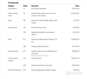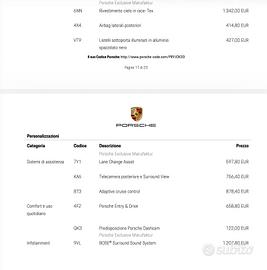 Attenzione per costare 134.000 € non ha soli quattro accessori come hanno tutte ma ciao una lista completa e totale tutto quello che ci poteva mettere. Tutto vuol dire tutto è in Porsche gli accessori se siete appassionati di questo marchio sono una lista infinita manca solo il gancio traino è incredibile ma vero, si può mettere.....