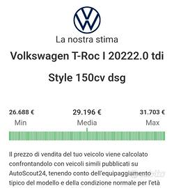SUPERPREZZO Tra i SUV/ Crossover più venduti! NUOVISSIMA VOLKSWAGEN T-ROC 2.0tdi 150cv DSG STYLE, Nero Mythos, accessoriatissima! Cambio Automatico DSG 7 rapporti, Paddle al volante, Sensori di parcheggio ant e post, Display multifunzione a colori 10,25" Digital Cockpit Pro, Schermo da 8" sensoriale con Apple Carplay Android, Cerchi in lega nero lucidi, Climatronic Bizona automatico Touch, Park Pilot, Fari diurni IQ-Light a Led anteriori, Led posteriori 3D, Interni misto pelle ed alcantara, Virtual Cockpit, Front assist con frenata d'emergenza City emergency Brake e riconoscimento pedoni, Lane assist, Mancorrenti satinati, Luci interne a Led, Griglia radiatore con listello cromato, Stabilizzatore rimorchio, Retrovisori esterni riscaldabili e ripiegabili elettronicamente, Cruise Controll adattivo, Sistema Start&Stop con recupero di energia, Illuminazione ambiente esterna, EDS ( Bloccaggio elettr del differenziale), Freni a Disco ant e post, Fari fendinebbia con funzione cornering, Emergency Call, Freno di stazionamento elettronico con funzione Auto Hold, ecc.. Immatricolata 2023 Soli 40'500km certificati Volkswagen ** NESSUN VINCOLO FINANZIARIO ** ** IVA INCLUSA NEL PREZZO ** ** PREZZO NON TRATTABILE** **Qualsiasi verifica da un Vs tecnico di fiducia, anche in casa madre **Storico Carfax disponibile **Autovettura proveniente da Volkswagen Italia **Unicoproprietario **Iva detraibile **Finanziabile **Possibilità di permuta **Garanzia estendibile fino a 36mesi " Da diversi anni, siamo stati selezionati come concessionario dalla community " NON PRENDERMI PER IL CHILOMETRO" , Team che promuove l'immagine di Rivenditori onesti, che rispecchiano standard di vendita mantenendo la massima trasparenza e chiarezza sulle autovetture proposte, con km certificati! ** Potrebbero verificarsi errori di battitura delle specifiche tecniche e/o optional per via dei vari veicoli e modelli, pertanto si prega quindi di chiamare per accettarsi delle caratteristiche