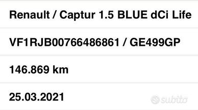 IVA ESPOSTA – AUTOCARRO 4 POSTI VETTURA ITALIANA - TARGA : GE 499 GP ULTIMA FOTO ( una parte della fattura d'acquisto ) : ALLESTIMENTO-TELAIO - TARGA ITALIANA - KM - ANNO D'IMMATRICOLAZIONE RENAULT CAPTUR cc1.5DCI 95CV allestimento LIFE , MARZO 2021 con 147100 km certificati UN SOLO PROPRIETARIO REVISIONE DA FARE AD AGOSTO 2027 BATTERIA NUOVA MESSA IL 21/04/2026 DUE CHIAVI CON TELECOMANDO Ottime condizioni generali interne, esterne e meccaniche SI VALUTANO PERMUTE Garanzia e possibilita' di finanziamenti agevolati . Si valutano permute . L'auto è disponibile a Sommatino ( CL ) in viale Fontaine 10( vicino la caserma dei carabinieri ) per qualsiasi vostra prova e controllo con meccanico di vostra fiducia . Non esitate a contattarmi per qualsiasi altra informazione alla mia email o direttamente al mio cellulare anche whatsapp PREZZO : 12900 euro - 1 ANNO DI GARANZIA CONFORMGEST SPA ( COMPLETA ) INCLUSA NEL PREZZO - PASSAGGIO DI PROPRIETA' ESCLUSO