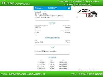 Ci trovi a Ponzano Veneto in via della Libertà 16 TCARS. T-CARS: Andrea: 3 4 5 7 8 6 0 8 5 6 Aron: 3 9 2 4 0 4 7 5 6 4 Anna: 3 3 1 3 6 0 0 4 2 2 Simone: 3 5 1 7 8 6 6 5 0 6 Auto in ottime condizioni generali POSSIBILE ATTIVAZIONE DI GARANZIA 3 ANNI TOP VALIDA IN TUTTO IL TERRITORIO EUROPEO LA VETTURA MONTA PNEUMATICI 4 STAGIONI Anno: 02/2015 Modello: CLIO 5 PORTE Cilindrata: 1.2 - 55 KW - 75 CV Cambio: MANUALE Alimentazione: BENZINA Classe ambientale: EURO 5 B KM ATTUALI: 119.000 Revisione valida fino: 12/2027 Distribuzione: CATENA Nessun problema di carrozzeria. Nessun problema di meccanica. Passaggio di proprietà in agenzia di fiducia. No perditempo. Massima serietà. Garanzia 12 mesi FULL con un contributo Telefona sempre per un appuntamento, per verificare la disponibilità della vettura e per confermare tutte le caratteristiche pubblicate nella descrizione. TEST DRIVE SU APPUNTAMENTO. NOTA BENE: TUTTE LE INFORMAZIONI DESCRITTE POSSONO ESSERE SOGGETTE A ERRORI E NON COMPORTANO IN ALCUN MODO OBBLIGO CONTRATTUALE. VERIFICA SEMPRE TUTTI I DATI. DAL LUNEDI AL VENERDI: 08:45 - 12:15 / 15:00 - 19:00 SABATO: 09:00 - 12:00 / 15:00 - 18:00 DOMENICA: CHIUSO