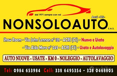 CLICCA SU "VAI ALLO SHOP" (IN BASSO) PER VEDERE QUASI TUTTO IL NOSTRO PARCO AUTO TI ASPETTIAMO IN SEDE " Venite a visitare il nostro parco Auto con oltre 80 veicoli Usati disponibili e Garantiti almeno 12 mesi* Tutti trattabili** in sede e Finanziabili*** anche senza anticipo a tassi super super Agevolati." " Si valuta qualsiasi permuta dopo uno scrupoloso stato d'uso della stessa " > CONSUMI RECORD > OK NEO PATENTATI > FULL FULL OPTIONAL > NUOVISSIMA E BELLISSIMA > UNICO PROPRIETARIO > KM 18.553 O-RI-GI-NA-LI e CERTIFICATI > PRATICA DA GUIDARE E MOLTO COMODA CON 5 PORTE > IN PERFETTE CONDIZIONI > TAGLIANDATA E REVISIONATA IN TUTTO > GOMMATA > DA NON FARCI NIENTE > GARANZIA 12 MESI* COMPRESA NEL PREZZOper viaggiare in assoluta tranquillità (estendibile fino a 36 mesi) DI SERIE: ¬ ALLESTIMENTO FULL ¬ NAVIGATORE ¬ RETROCAMERA ¬ CLIMATIZZATORE AUTOMATICO ¬ CAMBIO AUTOMATICO ¬ CERCHI LEGA ¬ VERNICE SPACIALE BIANCO QUARZO (valore euro 970,00) ¬ CAMBIO AUTOMATICO ¬ RADIO TOUCH CON COMANDI ALLO STERZO ¬ VETRI ELETTRICI ¬ USB ¬ BLUETOOTH ¬ SENSORI PARCHEGGIO ¬ CHIUSURA CENTRALIZZATA CON TELECOMANDO ¬ CRUISE CONTROL ¬ ESP ¬ ABS ¬ FARI FENDINEBBIA ¬ ACCENSIONE AUTOMATICA FARI ¬ FRENATA DI EMERGENZA ¬ STERZO E SEDILE REGOLABILI IN ALTEZZA ¬ RETROVISORI A COMANDO ELETTRICO ¬ VETRI PRIVACY ¬ 2 CHIAVI IN DOTAZIONE .....E TANTO ALTRO ANCORA ¬ GARANZIA 12 MESI* COMPRESA NEL PREZZO per viaggiare in assoluta tranquillità (estendibile fino a 36 mesi) Siamo un' Azienda che opera nel mondo delle Auto dal lontano 1971. Il nostro obiettivo è stato da subito vendere prodotti di qualità, garantiti e al giusto prezzo. Da noi compri Auto Tagliandate e Revisionate in tutto e soprattutto con KM ORIGINALI. Un Cliente soddisfatto per noi è la cosa a cui teniamo di più. Per questo siamo molto esigenti nel comprare Auto di qualità e originali. > NONSOLOAUTO SAS....... dal 1971 Via John Lennon, 131 87041 ACRI CS 0984 6539