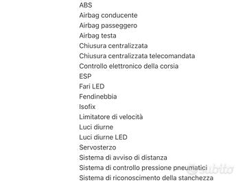 TOP SALES AUTOMOTIVE GROUP . VISITA NS SITO WEB TOPSALESAUTOMOTIVE.COM X NUOVE OFFERTE ( 150 AUTO DISPONIBILI ) VISITA NS SHOP AUTO SUBITO .IT X NUOVE OFFERTE ( 35 AUTO DISPONIBILI ) . SEAT ARONA 1.0 ECOTSI STYLE 110 CV . AUTOMATICA . CONSUMI RIDOTTI . AUTO IN PERFETTE CONDIZIONI. NESUN INTERVENTO DA ESEGUIRE. TAGLIANDATA . TAGLIANDI CERTIFICATI . FULL OPTIONAL ALLEGATO DATI COMPLETI ( LEGGI TUTTO) . PER OGNI INFORMAZIONE E VISIONE CONTATTARE ORARI UFFICI . O LASCIARE VS RECAPITO TELEFONICO O E-MAIL SARETE RICONTATTATI A BREVE . SALUTI . TOP SALES AUTOMOTIVE GROUP . ABS Airbag laterali Antifurto Chiusura centralizzata Fendinebbia Pretensionatore cinture Airbag per la testa Fari anteriori allo xeno (a scarica di gas) Riconoscimento segnali stradali Fari adattativi Isofix Chiusura centralizzata senza chiave Sistema di chiamata d'emergenza Airbag guida Airbag passeggero Immobilizzatore Airbag per le ginocchia Controllo automatico adattivo della velocità Fari anteriori a LED Controllo elettronico della corsia Luci diurne LED Sistema di controllo pressione pneumatici Luci diurne Appoggiatesta posteriori Climatizzatore Correttore assetto fari Retrovisori elettrici termici Ricircolo aria Vetri elettrici anteriori Volante regolabile Interni in materiale pregiato Vernice metallizzata Sensore luci Hill Holder Controllo automatico clima Volante in pelle Cambio automatico Controllo automatico velocità Indicatore temperatura esterna Retrovisori elettrici Retrovisori ripiegabili elettricamente Sedile guida regolabile in altezza Servosterzo Tergilunotto Vernice speciale Vetri elettrici posteriori Sensore pioggia Bracciolo sedili anteriori Head-up display Start/Stop Automatico Parabrezza riscaldato Sensore di luminosità Supporto lombare Volante multifunzione Tempomat Riscaldamento ausiliario Autoradio Bluetooth Radio DAB Lettore MP3 Computer di bordo Sound system USB Navigatore satellitare Con