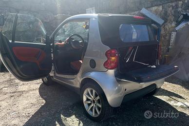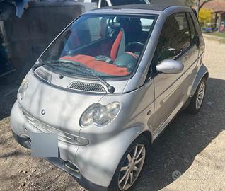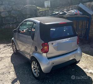 Smart ForTwo Cabrio. Anno di immatricolazione: 25/10/2006. Chilometri percorsi: contachilometri automobile 157 mila chilometri, motore nuovo 23 mila chilometri documentabili. Alimentazione e cilindrata: benzina, 698 cm3. Potenza: 45kW. Tipo di cambio: meccanico/automatico e sequenziale. Normativa Euro: Euro 4. Accessori: copri auto, 1 gomma anteriore e 1 gomma posteriore M+S. Revisione regolare fino al 25/05/2027. Utilizzata principalmente in paese e dintorni. Optional: tetto decappottabile da manutentare.