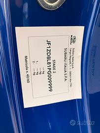 SOLO 60 ESEMPLARI IN TUTTO IL MONDO, allestita esclusivamente per il mercato italiano con cerchi forgiati OZ, scarico sportivo, finiture a contrasto, battitacco con numerazione, body lips esteriori nero lucido, nel classico ed intramontabile WR Blue Pearl, marchio di fabbrica di tutte le special marchiate Subaru Tecnica International! L'esemplare in oggetto è la numero 40/60, ordinata al lancio, nel 2023, dal fortunato ed unico proprietario presso Subaru Varese. Vista la rarità, è stata conservata come un'auto da museo, sempre sotto il telo in dotazione, e mai utilizzata con l'acqua. Solo 2500km all'attivo, percorsi nel suo habitat più naturale: i passi di montagna, fuori dal traffico e dalle buche degli asfalti cittadini.. Tutto il corredo in dotazione alla consegna da nuova è ovviamente disponibile, come si può vedere dalle foto. Visionabile solo su appuntamento, previa chiamata al Valutazione permuta; Possibilità di finanziamento; Garanzia ufficiale ancora attiva.