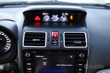 TETTO APRIBILE ELETTRICO IN CRISTALLO CON FUNZIONI DI SCORRIMENTO ED INCLINAZIONE VERNICE PERLATO SEDILE GUIDA A REGOLAZIONE ELETTRICA 10 POSIZIONI SEDILI ANTERIORI RISCALDABILI SEDILI ANTERIORI SPORTIVI IN TESSUTO CON CUCITURE BLU SI-DRIVE (SUBARU INTELLIGENT DRIVE) SISTEMA SIRI EYES FREE SISTEMA VDC (VEHICLE DYNAMICS CONTROL) CON TASTO DI ESCLUSIONE SISTEMA VIVAVOCE COMPATIBILE BLUETOOTH SRVD SUBARU REAR VEHICLE DETECTION START & STOP (DISPOSITIVO AUTOMATICO) VOLANTE REGOLABILE IN ALTEZZA E PROFONDITÀ VOLANTE SPORTIVO D SHAPE IN PELLE SISTEMA SUBARU STARLINK CON SIST. DI NAVIGAZIONE A SCHEDA SD E SIST.AUDIO: 1 CD E 6 ALT. ABS A 4 SENSORI/4CANALI CON EBD (RIPARTITORE ELETTRONICO DI FRENATA) ACTIVE TORQUE VECTORING AIRBAG SRS A TENDINA ANTERIORI E POSTERIORI AIRBAG SRS GINOCCHIA AIRBAG SRS LATERALI LATO GUIDA E PASSEGGERO ANCORAGGI ISO-FIX PER SEGGIOLINI PER BAMBINI (CON ANCORAGGI A CINGHIA) AUTO VEHICLE HOLD BARRE DI RINFORZO ANTI-INTRUSIONE NELLE PORTE ANTERIORI E POSTERIORI BRAKE ASSIST SYSTEM BRAKE OVERRIDE SYSTEM (SIST. DI PRIORITÀ DEL PEDALE FRENO SULL'ACCELERATORE IN CASO DI EMERGENZA) CAMBIO AUTOMATICO LINEARTRONIC CERCHI IN LEGA LEGGERACLIMATIZZATORE AUTOMATICO BI-ZONA CON FILTRO ANTI-POLLINE COMANDI AUDIO AL VOLANTE CONSOLLE CENTRALE CON DOPPIA PRESA USB CRUISE CONTROL DISPLAY MULTIFUNZIONE 5.9" LCD DISPOSITIVO DI VIDEO ASSISTENZA RETROMARCIA CON TELECAMERA FRONT VIEW MONITOR EYESINGHT ASSIST MONITOR HBA HIGH BEAM ASSIST PADDLE SHIFT AL VOLANTE PRIVACY GLASS - CRISTALLI PORTE POSTERIORI, QUARTI POSTERIORI E LUNOTTO OSCURATI RETROVISORI RISCALDABILI RIPIEGABILI ELETTRICAMENTE CON INDICATORE DI DIREZIONE A LED INTEGRATO