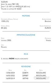 Vendesi Suzuki Jimny del 2005. Si consegna tagliandata e revisionata. IDEALE PER NEOPATENTATI. - UNICO PROPRIETARIO - CARATTERISTICHE: Anno Imm. 06/2005 Carburante Benzina Potenza 63KW (85CV) Cambio Manuale Chilometraggio 223’000 Scocca Fuoristrada, 3 Porte Tipo di dotazione 1.3i 16V cat 4WD JLX Consumo carburante 7.3l/100 km Categoria di emissione Euro 4 Colore Bronzo Condizioni/Manutenzione In buone condizioni NEOPATENTATI SI Revisione 06/2026 Costo passaggio (non incluso) € 500,00 Dotazione ABS, Airbag passeggero, Alzacristalli elettrici, Antifurto, Chiusura centralizzata, Radio, Servosterzo, Aria condizionata