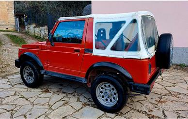 Suzuki Samurai Santana SJ500 rosso metallizzato. Distribuzione rifatta, tamburi freni nuovi, crociere cambiate con quelle con ingrassatore, radiatore nuovo, sedili in pelle, frizione nuova, blocco mozzi anteriori. 1298 cc, 51 KW.