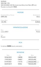 Vendesi Suzuki SX4 2.0 Diesel del 2013. Si consegna tagliandata e revisionata. GARANZIA 12 MESI CERTIFICATA - FINANZIABILE - UNICO PROPRIETARIO - CARATTERISTICHE: Anno Imm. 07/2013 Carburante Diesel Potenza 99KW (135CV) Cambio Manuale Chilometraggio 142.000 km Scocca SUV, 5 Porte Tipo di dotazione 2.0 DDiS 16V Outdoor Line Evolution Navi Consumo carburante 4.9l/100 km Categoria di emissione Euro 5 Colore Argento Condizioni/Manutenzione Veicolo non incidentato, in buone condizioni NEOPATENTATI SI Revisione 06/2027 Dotazione ABS,Airbag laterali, Airbag passeggero, Airbag per la testa, Alzacristalli elettrici, Antifurto, Aria condizionata, CD, Cerchi in lega, Chiusura centralizzata, Chiusura centralizzata con telecomando, Computer di bordo, ESP, MP3, Radio, Sedile posteriore sdoppiato, Servosterzo, Specchietti elettronici, Sensori parcheggio post.