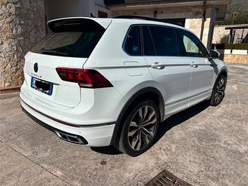 Volkswagen Tiguan R-Line 1.5 tsi benzina, 150 cavalli, cambio automatico DSG, anno 07/2023, unico proprietario, assetto sportivo con sterzo progressivo, colorazione bianco con tutte le rifiniture cromate, cerchi in lega Suzuka da 20 pollici, fari full led, sensori di parcheggio anteriori e posteriori, Park assist, vetri posteriori privacy, volante in pelle multifunzionale con comandi touch, cruise control adattivo con mantenimento di carreggiata, luci automatiche, auto in condizioni impeccabili, senza un graffio, garanzia fino a 4 anni.