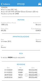Salve vendo stupenda Toyota Aygo 1.0 68 Cv adatta alla guida per neopatentati è dai consumi bassissimi Anno 2012 con 115.000 Km..Unico Proprietario..Revisionata..Gommata al 70%..Doppie Chiavi è Appena Tagliandata con ( Filtri , Olio e Frizione..) Auto in perfette condizioni generali e non necessita di alcun intervento..Motore , Meccanica è Carrozzeria in ottime condizioni..Interni senza alcun segno di usura..Modello Full Optional è dotata di alza cristalli elettrici..chiusura centralizzata..clima..servo sterzo..stereo originale di serie con collegamento aux..navigazione ecc..