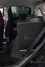 Proponiamo unica Toyota Aygo 1.0 con impianto stereo da gara. Necessita assolutamente di nessun tipo di manutenzione, tagliando fatto ogni 5000 km e frizione con bobine e candele appena montati. Elaborazione tuning professionale fatta da uno dei migliori installatori d’Italia. Impianto composto da: Stereo Alpine con equalizzatore e 6 uscite RC due batterie al gel da 125ah 6 tweeter da 200watt 6 woofer pro audio da 300watt 2 subwoofer AC recone da 38cm da più di 5000watt l’uno Amplificatore hertz per trombe Ampli Ipnosis per medi Ampli Gladiator da 10.000 watt per sub. LED interno Comando apertura porte con pulsante illuminato Comando vetri spostato al centro Cavi unipolari sovradimensionati per avere tutto in sicurezza con tanto di fusibile sia sul vano batteria anteriore che sul vano batteria posteriore Indicatore livello batteria voltometro al centro Vetri scuri professionali con pellicola solarscreen tonalità limousine. Cerchi in lega della OZ con gomme nuove Tenuta maniacalmente, possibilità di cambiare il colore dei pannelli interni a vostro piacimento. Mai usata per fare gare di stereo, solo uso amatoriale, mai portato il mio volume al massimo (utilizzata con volume 23/35 per 3/4 minuti non più. Per chi è interessato ad utilizzare la seduta posteriore viene fornito anche un altro subwoofer, naturalmente più piccolo, dimensionato apposta per il portabagagli. Ovviamente le parti originali sono state conservate. solo per realmente interessati, no curiosi, solo per chi sa di cosa si sta parlando. Chiamare per qualsiasi informazione. Il prezzo è irrisorio rispetto al valore dell’impianto, l’auto è praticamente il regalo rispetto al valore dell’elaborazione. Solo il Gladiator costa 4000€!!! L’auto viene venduta con impianto perfettamente funzionante testato e collaudato, viene mostrato come funziona e come utilizzarlo, verrà verificato tutto il funzionamento prima dell’acquisto, non siamo responsabili in caso di utilizzo scorretto.
