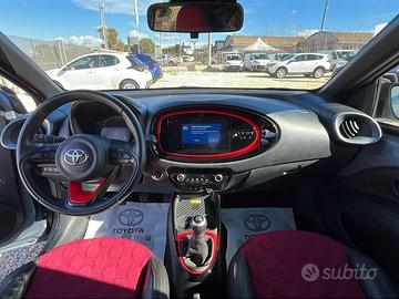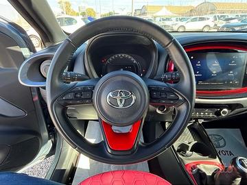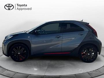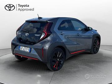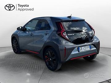 2 Freni a disco (anteriori autoventilanti) - 6 airbag SRS - ABS + Ripartitore elettronico della frenata (EBD) + Assistenza alla frenata (BA) - Abitacolo indeformabile ad alta protezione - Alette parasole con specchietto - Alzacristalli elettrici anteriori - Assistenza alla partenza in salita (HAC) - Avvisatore acustico cinture di sicurezza anteriori e posteriori - Battitacco specifico con logo Aygo X - Bocchette dell'aria condizionata nere lucide - Cambio manuale a 5 marce - Cassetto portaoggetti lato passeggero richiudibile - Cerchi in lega da 18" neri lavorati con pneumatici 175/60/ R18 - Chiamata di emergenza E-call - Chiusura centralizzata con radiocomando - Cinture di sicurezza anteriori a 3 punti con pretensionatore e limitatore di forza - Climatizzatore automatico - Comandi multifunzione al volante - Connect Pack - Contagiri - Controllo elettronico della stabilità (VSC) e della trazione (TRC) - Dettaglio del volante in tinta con la carrozzeria anodizzato - Disattivatore airbag frontale lato passeggero - Display multi-informazioni con schermo a colori da 4,2" - Fari a LED - Garanzia 3 anni o 100.000 km - Illuminazione interna Ambient - Intelligent Adaptive Cruise Control (i-ACC) - Cruise Control Adattivo Intelligente - Interni in pelle e tessuto con finiture sedili anteriori in tinta con la carrozzeria - Kit riparazione pneumatici - Luce vano bagagli - Luci d'emergenza attive - Luci posteriori a LED "Light Guide" - Maniglie in tinta con la carrozzeria - Maniglie interne cromate - Modanatura del cambio e portabicchieri nera lucida e dettaglio anodizzato in tinta con la carroz. - Modanatura display centrale anodizzata in tinta con la carrozzeria - Piantone dello sterzo collassabile - Retrovisori esterni regolabili elettricamente e riscaldabili - Rifinitura paraurti anteriore e posteriore Argento - Rilevamento presenza passeggeri sedili post. RSRS (sensore abbandono bambini) - Schienale posteriore abbattibile 5