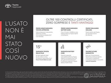 DEK:[10826270] Il prezzo indicato è subordinato alle promozioni A. CORVI in corso. INCLUSA NEL PREZZO (a prescindere dal metodo di pagamento), GARANZIA TOYOTA APPROVED: 12 mesi con assistenza stradale 24/7; 12 mesi di garanzia con chilometraggio illimitato; Primo tagliando omaggio. Inoltre, effettuando regolare manutenzione presso la rete di assistenza Toyota, riceverai un anno di GARANZIA TOYOTA RELAX PLUS ad ogni tagliando fatto da noi, fino a 15 anni di età della tua auto*. Infine, potrai usufruire anche del servizio di finanziamento Toyota Easy Used. L’unico che ti offre il Valore Futuro Garantito sull’usato e ti permette di includere tagliandi e pacchetti assicurativi nella rata. NB: In alcuni casi, la dotazione tecnica e gli optional potrebbero differire, pertanto è raccomandabile consultare i nostri consulenti alle vendite ai seguenti numeri - al fine di evitare incongruenze in fase contrattuale. Per poter offrire il miglior servizio ti invitiamo a prendere un appuntamento con un nostro consulente dedicato Toyota A. Corvi è Concessionario ufficiale Toyota. Service autorizzato Toyota e Lexus. Noleggio a lungo Termine KINTO ONE