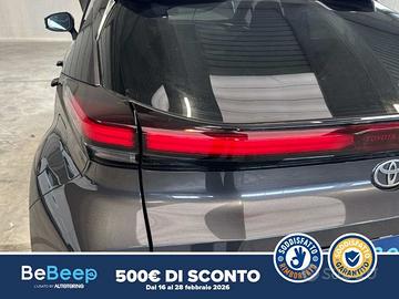 3 anni o 100.000 km, 5 Anni o 100.000 Km sulle componenti ibride, Abbaglianti automatici (AHB), Aggiornamenti (OTA), Airbag SRS anteriori frontali, Airbag SRS anteriori laterali, Airbag SRS centrale, Airbag SRS posteriori laterali, Alzacristalli elettrici anteriori e posteriori, Antenna Shark, Assistenza all'uscita sicura (SEA), Assistenza alla sterzata di emergenza (ESA), Assistenza alle ripartenze in salita (HAC), Assistenza proattiva alla guida (PDA), Avviso di cambio corsia con controllo dello sterzo (LDA con SC), Avviso di rilevamento della stanchezza (DAA), BA, Battitacco in alluminio dedicato Toyota c-hr, Cerchi in lega da 18"" con pneumatici 225/55 R18, Cinture di sicurezza anteriori regolabili in altezza con pretensionatore e limitatore