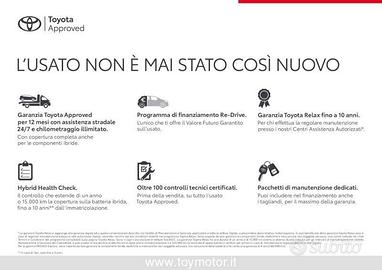 4 freni a disco (anteriori autoventilanti) - 7 airbag SRS - ABS + EBD + BA - Alzacristalli elettrici anteriori e posteriori - Antenna "Shark" - Assistenza alla partenza in salita (HAC) - Cambio a variazione continua (E-CVT) - Cerchi in lega da 18" con pneumatici 225/50 R18 - Cinture di sicurezza anteriori regolabili in altezza con pretensionatore e limitatore di forza - Climatizzatore automatico bi-zona - Computer di bordo multifunzione - Controllo della trazione (TRC) - Controllo elettronico della stabilità (VSC+) - Display multi-informazioni TFT a colori da 4,2" - Dispositivo Follow Me Home - Fari anteriori base parabola LED - Fari fendinebbia alogeni - Fari posteriori alogeni - Freno di stazionamento elettronico - Garanzia 3 anni o 100.000 km - Garanzia 5 anni o 100.000 km sulle componenti ibride - Illuminazione ambiente interno - Interruttore disinserimento airbag frontale lato passeggero - Kit riparazione pneumatici - Luci diurne a LED - Retrovisori esterni ripiegabili elettricamente e riscaldabili - Rivestimento dei sedili in pelle sintetica e tessuto - Sedile guidatore regolabile in altezza e con supporto lombare regolabile elettricamente - Sedile passeggero regolabile in altezza - Sedili anteriori riscaldabili - Sedili posteriori abbattibili 40/60 - Sensore crepuscolare - Sensore pioggia - Sensori di parcheggio ant. e post. con funzione ICS anticollisione - Sistema acustico di avviso presenza veicolo (AVAS) - Sistema di ritenuta ISOFIX - Sistema multimediale Toyota Smart Connect - Smart Entry & Push Start - Specchietto retrovisore interno elettrocromatico - Telecamera posteriore di assistenza al parcheggio - Toyota Safety Sense - Vernice metallizzata - Vetri posteriori oscurati - Volante in pelle regolabile in altezza e profondità