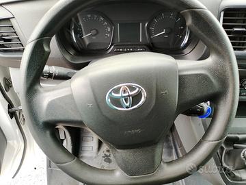 Climatizzatore manuale, Portabicchieri lato conducente e passeggero, Vano portaoggetti aperto nel cruscotto, Volante regolabile in altezza e in profondità, Sedile guidatore con bracciolo, Cassetto portaoggetti illuminato e refrigerato, Tavolino a scomparsa nel sedile centrale, Sedile guidatore regolabile in altezza e supporto lombare, Parabrezza ad isolamento acustico, Porte posteriori a pannello 50/50 apertura 180°, Retrovisore interno, Sedile passeggero a due posti con Smart Cargo, Ruota di scorta, Omologazione autocarro, TOYOTA FOR YOU fino a 10 anni o 250.000 km, Predisposizione gancio di traino, Alette parasole, Porta laterale destra scorrevole, Paratia vetrata, Plafoniera con 2 luci aggiuntive direzionali, Chiusura centralizzata con radiocomando (serratura meccanica solo su portiera lato conducente), Radio (DAB,Comandi multifunzione al volante, Bluetooth, USB) con 4 altoparlanti, Computer di bordo multifunzione, Cerchi in acciaio da 16" con copri mozzo e pneumatici 215/65 R16 C, Presa 12V sul cruscotto, nel cassetto portaoggetti e nel vano di carico, Maniglie esterne - nere, Paraurti anteriore e posteriore - neri, Retrovisori esterni elettrici e riscaldati - neri, Fari fendinebbia, Sensore crepuscolare con fari automatici, Fari anteriori alogeni con Luci diurne, Sedili in tessuto grigio e vinile, Poggiatesta anteriori, ABS, Airbags SRS frontali lato conducente,