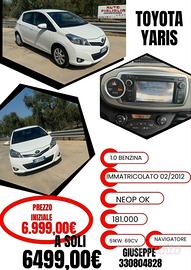 Bellissima TOYOTA YARIS 1.0 5 porte benzina 69cv 51kw cambio manuale immatricolata FEBBRAIO 2012 con 181.860 chilometri tenuta in ottime condizioni.Il veicolo è dotato dei seguenti optional: Airbag, Airbag Passeggero, Airbag posteriore, Chiusura centralizzata telecomandata, ESP, 4 Alzacristalli elettrici, Boardcomputer, Chiusura centralizzata, Climatizzatore, Isofix, Specchietti laterali elettrici, Volante in pelle, Autoradio, Airbag laterali, Airbag testa, Controllo trazione, Fendinebbia,ABS, Volante multifunzione, Cerchioni in acciaio, Pneumatici estivi, Climatizzatore automatico, 2 zone, Sedile posteriore sdoppiato, Servosterzo, Bluetooth, Funzione TV, Schermo multifunzione interamente digitale, Lettore CD, MP3, Vivavoce,NAVIGATOREImmobilizzatore elettronico,Retrocamera posteriore-----------------------------------------------------------------------------------------------------------------------------------------Vettura a disposizione e realmente presente nella nostra sede presso AUTOFIGLIOLIA Andria(BT)Contattateci per ulteriori informazioni o per fissare un appuntamento per visione o prova.GIUSEPPE