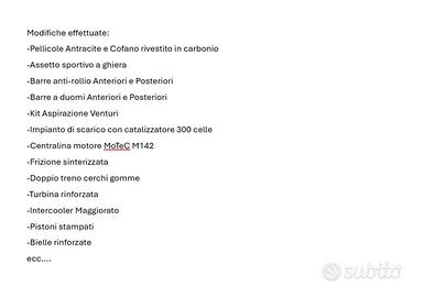Chilometraggio: 8200 Condizioni: usato Immatricolazione: 06/2021 Tipologia: 2/3-Porte Carburante: Benzina Tipo di cambio: Manuale ABS, Airbag, Airbag laterali, Airbag Passeggero, Airbag testa, Alzacristalli elettrici, Android Auto, Apple CarPlay, Autoradio, Autoradio digitale, Bluetooth, Cerchi in lega, Cerchi in lega da 18", Chiusura centralizzata, Chiusura centralizzata senza chiave, Chiusura centralizzata telecomandata, Climatizzatore, Controllo trazione, Cruise Control, ESP, Fari full-LED, Fari LED, Fendinebbia, Immobilizzatore elettronico, Interni in pelle, Luci diurne, Luci diurne LED, MP3, Pneumatici da neve, Pneumatici estivi, Pneumatici quattro stagioni, Sedile posteriore sdoppiato, Sedili sportivi, Sensore di pioggia, Servosterzo, Sospensioni sportive, Sound system, Specchietti laterali elettrici, Spoiler, Telecamera per parcheggio assistito, Touch screen, Trazione integrale, USB, Veicolo elaborato, Vetri oscurati, Vivavoce, Volante in pelle, Volante multifunzione Per un miglior servizio, per visionare le auto in esposizione nel concessionario RossettoMotors, riceviamo per appuntamento. Tel. Cell. WhatApp. Rossetto Motors Treviso IL VEICOLO E' STATO ELABORATO PER PARTECIPARE A COMPETIZIONI SPORTIVE, NELLO STATO ATTUALE PUO' CIRCOLARE SOLO SU STRADE CHIUSE. IL VEICOLO VIENE CONSEGNATO CON RICAMBI ORIGINALI PER ESSERE RIPRISTINATO PER USO STRADALE. Modifiche effettuate: -Pellicole Antracite e Cofano rivestito in carbonio -Assetto sportivo a ghiera -Barre anti-rollio Anteriori e Posteriori -Barre a duomi Anteriori e Posteriori -Kit Aspirazione Venturi -Impianto di scarico con catalizzatore 300 celle -Centralina motore MoTeC M142 -Frizione sinterizzata -Doppio treno cerchi gomme -Turbina rinforzata -Intercooler Maggiorato -Pistoni stampati -Bielle rinforzate ecc.... -VI OFFRIAMO FINANZIAMENTI PERSONALIZZATI E POLIZZE AUTO ESSENDO GLI ANNUNCI INSERITI TRAMITE PROGRAMMI AUTOMATICI,