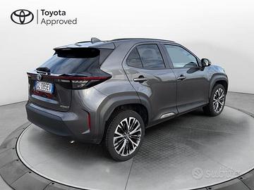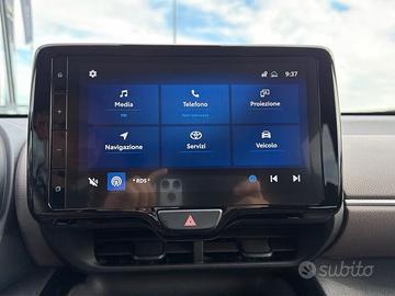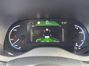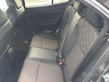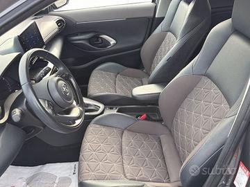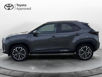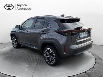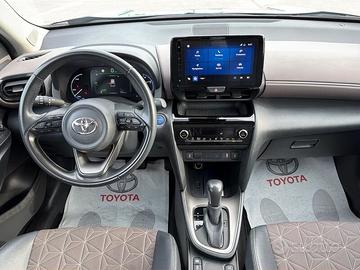 7 airbag SRS - ABS + EBD + BA - Alzacristalli elettrici anteriori e posteriori - Assistenza alla partenza in salita (HAC) - Avvisatore acustico cinture di sicurezza anteriori e posteriori - Barre longitudinali - Battitacco specifico con logo Yaris Cross - Bracciolo anteriore - Cambio a variazione continua (E-CVT) - Cassetto portaoggetti - Cerchi in lega da 18" - Chiusura centralizzata con radiocomando - Cinture di sicurezza anteriori con pretensionatore e limitatore di forza - Climatizzatore automatico bi-zona - Comandi multifunzione al volante - Comfort Pack - Controllo elettronico della stabilità (VSC) e della trazione (TRC) - Disattivazione airbag frontale lato passeggero - Display multi-informazioni con schermo a colori da 7" - Fari anteriori a LED - Fari fendinebbia a LED - Fari posteriori High LED con indicatori di direzione sequenziali - Finiture cruscotto in materiale "Soft Touch" - Freno di stazionamento elettrico (EPB) - Freno di stazionamento elettronico con funzione Hold - Garanzia 3 anni o 100.000 km - Garanzia 5 anni o 100.000 km sulle componenti ibride - Illuminazione interna Ambient - Interni in pelle e tessuto - Kit riparazione pneumatici - Luci d'emergenza attive - Maniglie in tinta con la carrozzeria - Piantone dello sterzo collassabile - Retrovisori esterni regolabili elettricamente e riscaldabili - Retrovisori esterni ripiegabili elettricamente - Sensori pioggia e crepuscolare - Servosterzo elettrico - Sistema audio a 6 altoparlanti - Sistema di monitoraggio pressione pneumatici (TPWS) - Sistema di ritenuta ISOFIX - Sistema multimediale Toyota Smart Connect: - Smart Entry & Push Start system - Specchietto retrovisore interno elettrocromatico - Spoiler posteriore - Supporto lombare lato guida - Telecamera posteriore di assistenza al parcheggio - Tetto panoramico - Toyota Safety Sense 2.5 - Vernice Monotone - Vernice metallizzata - Vetri posteriori oscurati - Volante in pelle - Volante regolabil