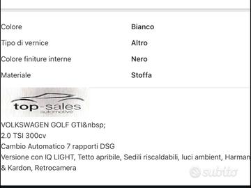 BUONGIORNO. TSA GROUP AUTOMOTIVE . VI PROPONE VOLKSWAGEN GOLF GTI CLUBSPORT 2.0 TSI GTI DSG 300 CV . FULL OPTIONAL . NAVI . CERCHI LEGA . GOMMATA NUOVA . TETTO PANORAMICO APRIBILE .AUTO PERFETTA . NESUN INTERVENTO DA FARSI . TAGLIANDI CERTIFICATI . X INFORMAZIONI DETTAGLIATE DISPONIBILITÀ E VISIONE GRADITO APPUNTAMENTO CONTATTARE ORARI UFFICI . O LASCIARE VS RECAPITO TELEFONICO O E-MAIL SARETE RICONTATTATI DA NS STAFF COMMERCIALE . VISITA NS SHOP X PARCO AUTO .
