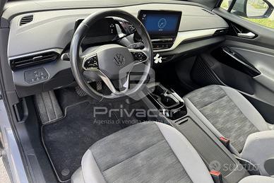 PERIZIA DELL'ESPERTO PRIVACAR: VOLKSWAGEN ID.4 City Elettrica della casa VW, questa crossover offre tanto spazio all'interno dell'abitacolo specialmente nella seduta posteriore grazie alla mancanza del tunnel centrale (pavimento piatto) e nel bagagliaio che è veramente capiente, arriva fino a 1575 litri!! Molto comoda e bene sonorizzata, i viaggi si affrontano con tranquillità e in modo rilassato. La macchina e molto vivace e la spinta si fa sentire subito. Con un'autonomia di 400-450 km (con guida normale) copre distanze medio lunghe senza problemi di nessun genere e se si è prudenti alla guida si può arrivare fino a 500 km considerando che si può variare il livello della frenata rigenerativa. La sicurezza attiva e passiva sulla ID.4 è quasi totale, l'elenco è lungo. Non rimane che venire a vederla e provarla su strada. Chiamatemi per prenotare un appuntamento!!