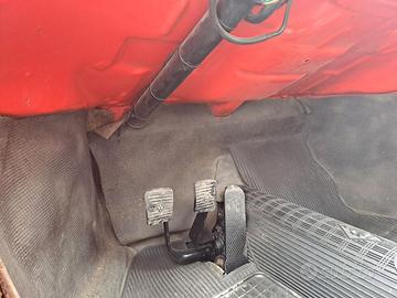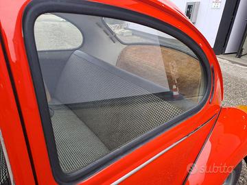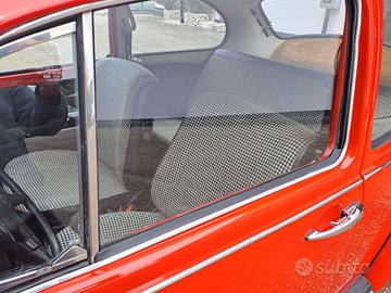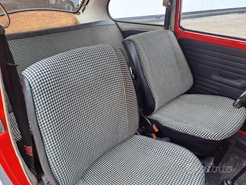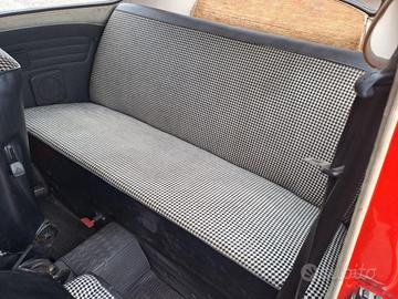 I sedili montati su questo esemplare sono originali Volkswagen, appartenenti alla versione 1200 "L" (Lusso) prodotta negli ultimi anni di commercializzazione europea. La tappezzeria è realizzata in tessuto pied-de-poule (noto anche come "pepita"), un motivo classico bianco/nero molto ricercato tra gli appassionati del Maggiolino.