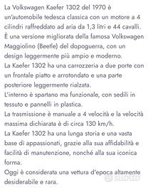 Come da titolo vendo maggiolone 1302 restaurato in maniera maniacale con certificato asi , versione del maggiolone con vetro piatto e cruscotto in ferro , oltre ad avere speciali cerchi originali dell’epoca, senza alcun imperfezione , senza perdiata di olio , senza alcun segno di ruggine. Praticamente come uscito dalla fabbrica .tutto nuovo incluso serbatoio e gomme.