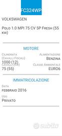 FOTO PROVVISORIE-- AUTO IN ARRIVO--BELLISSIMA!!! Volkswagen Polo 1.0 MPI -5 porte FRESH - EURO 6- HA PERCORSO CIRCA 8000 KM ALL'ANNO!!! ( auto dai consumi molto bassi, DATI DELLA CASA MADRE- 25 km al litro, (velocità media 84 km orari) e tutto questo grazie allo straordinario motore a tre cilindri benzina) -FOTO ULTIME 4 REVISIONI-UNICA PROPRIETARIA -BOLLATA FINO AL 01-2027-OK NEOPATENTATI- KM 85000 "ASSOLUTAMENTE O-RI-GI-NA-LI", NIENTE TARGHE NASCOSTE!! QUALSIASI VERIFICA. SE RICHIESTO INVIO COPIA LIBRETTO CIRC. FOTO ULTIMA REVISIONE APPENA FATTA LI 02-2026 A KM 84000 - CARROZZERIA TAPPEZZERIA E MECCANICA IN OTTIME CONDIZION. Cilindrata 1000 MPI, KW 55--CV 75- RADIO TOUCH CON AUX-USB E TELEFONO BLUETOOTH DI SERIE, COMPUTER--HILL HOLDER, sistema elettronico, gestito dall'ESP, che assiste automaticamente il guidatore nelle partenze in salita-- SEDILE ANTERIORE REGOLABILE IN ALTEZA, ISOFIX, SPECCHI ESTERNI ELETTRICI, ALZAVETRI ELETTRICI, 2 TELECOMANDI APRIPORTA, GOMME SEMINUOVE. Interni molto curati, Igienizzati Professionalmente, Non Fumatore, scrupoloso controllo generale prima della consegna, 1 ANNO DI GARANZIA, QUALSIASI PROVA, TUTTA FINANZIABILE. -----ANCHE FINANZIAMENTO A RATE FINO A 5000,00 SENZA BUSTA PAGA, ANCHE SENZA NESSUN REDDITO!!!! La Nostra Attivita' ci coinvolge con una grande passione ultratrentennale. Facilmente Raggiungibili a 1km dall'uscita Tolentino Ovest della superstrada Civitanova Marche - Foligno. a 5 min. dalla Stazione FFSS di TOLENTINO