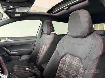 Climatizzatore Manuale, Tasche portaoggetti agli schienali dei sedili anteriori, Vano portaoggetti sotto il sedile anteriore sinistro, 2 luci LED nel vano piedi anteriore, Illuminazione ambiente (monocromatica) su inserti portiere e plancia strumenti, Luci interne LED con spegnimento ritardato, 2 luci di lettura LED anteriori, Luci interne LED con spegnimento ritardato, 2 luci di lettura LED posteriori, Illuminazione vano bagagli, Sedile conducente e passeggero con regolazione in altezza, Divano posteriore non sdoppiabile, schienale ribaltabile e sdoppiabile asimmetricamente, Sedili anteriori sportivi, Volante multifunzione in pelle con palette (per DSG), Filtro antipolline, Filtro antipolvere, Cielo nero titanio, Pomello della leva del cambio in pelle, Supporto lombare a regolazione manuale per i sedili anteriori, 5 porte, Fanale retronebbia, Fondo vano bagagli in 2 livelli, regolabile in altezza, Impugnatura leva freno a mano in pelle, Pedali in acciaio spazzolato, Regolazione profondità luce dei proiettori, Specchietto retrovisore esterno asferico, lato conducente, Specchietto retrovisore esterno destro, convesso, Trazione anteriore, Volkswagen Connect, Kit antiforatura con compressore a 12 Volt ed ermetizzante per pneumatici, Inserti decorativi Velvet Red, Chiusura centralizzata con telecomando a radiofrequenza e 2 chiavi estraibili, Bulloni antifurto, Ammortizzatori posteriori, versione sportiva, Radio "Composition Media", Active Info Display, Wireless charging, Cerchi in lega "Milton Keynes" da 7,5 J x 17'' in colore nero con superficie tornita lucida, Porta USB compatibile con dispositivi Apple (cavo escluso), Sistema start-stop con sistema di recupero energia in frenata, Paraurti con design sportivo, prese d'aria con struttura a nido d'ape ed estensione minigonne di colore Nero, Specchietti retrovisivi esterni regolabili e riscaldabili elettricamente, Climatizzatore automatico bizona "Climatronic",