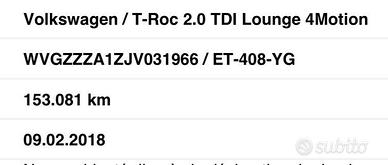 AUTO TENUTA CON MOLTA CURA ULTIMA FOTO ( una parte della nostra fattura d'acquisto ): ALLESTIMENTO-TELAIO - TARGA ESTERA - KM - ANNO D'IMMATRICOLAZIONE Volkswagen T-ROC cc2.0 TDI DSG7 4MOTION STYLE 150CV ,automatica e sequenziale , EURO 6 , FEBBRAIO 2018 , con 153081 km CERTIFICATI DUE CHIAVI CON TELECOMANDO Ottime condizioni generali interne, esterne e meccaniche. Garanzia e possibilita' di finanziamenti agevolati. SI VALUTANO PERMUTE L'auto è disponibile a Sommatino ( CL ) in viale Fontaine 10( vicino la caserma dei carabinieri ) per qualsiasi vostra prova e controllo anche con meccanico di vostra fiducia . Non esitate a contattarmi per qualsiasi altra informazione alla mia email o direttamente al mio cellulare anche whatsapp PREZZO : 15999 euro - 1 ANNO DI GARANZIA INCLUSA da 400 euro - PASSAGGIO DI PROPRIETA' ESCLUSO ( 750 euro )