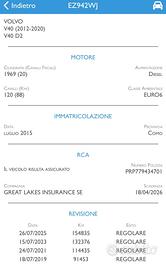Volvo v40 -Informiamo i nostri clienti che, al fine di garantire un miglior servizio, è necessario fissare un appuntamento per la visione delle auto. Tutte le nostre auto vengono controllate prima di essere messe in vendita, inoltre vengono anche sottoposte a sanificazione totale dell’interno, controllo motore e impianti elettrici. -Possibilità ritiro permuta Descrizione auto: Appena ritirata in permuta! Splendida volvo v40 con uno storico tagliandi da paura! Tagliandata e super affidabile, Ottime condizioni! EURO 6 *PRONTA CONSEGNA* 12 mesi di garanzia estendibile fino a 24/36mesi CHI SIAMO? SIAMO UNA PICCOLA REALTÀ NEL CUORE DI VEDANO OLONA, PICCOLO PAESINO DELLA PROVINCIA DI VARESE. Le nostre piattaforme di vendita: IL NOSTRO TEAM E COMPOSTO DA GIOVANNI 'TITOLARE' E RICCARDO, RAGAZZI GIOVANI E CON LA PASSIONE DEI MOTORI. CERCHIAMO DI OFFRIRE I MIGLIORI PRODOTTI AL MIGLIOR PREZZO. MA SPECIALMENTE SENZA TRUCCHI E SENZA INGANNI!!!!! -SCORRI IN BASSO E VISITA IL NOSTRO SHOP -Possibilità di prova su strada Nostra pagina facebook Autopalma instagram Autopalma22 Scorri in basso e visita il nostro shop Per ulteriori info ufficio Riccardo Bonati Giovanni Palma La nostra politica aziendale? Dare l’opportunità di vivere un’altra vita ad un’auto usata! I km non vengono scalati “al contrario dei soliti furbetti” ci accertiamo che l’auto passi tutte le prove prima della vendita al privato,controlli approfonditi su parti meccaniche e di semplice usura,tagliando pre consegna! Effettuiamo servizio navetta da stazioni oppure da aeroporti!